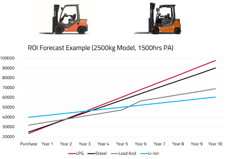 For example, the ROI forecast below compares a 2500kg counterbalance truck operating 1,500 hours per year across four energy types: LPG, diesel, lead-acid, and lithium-ion.